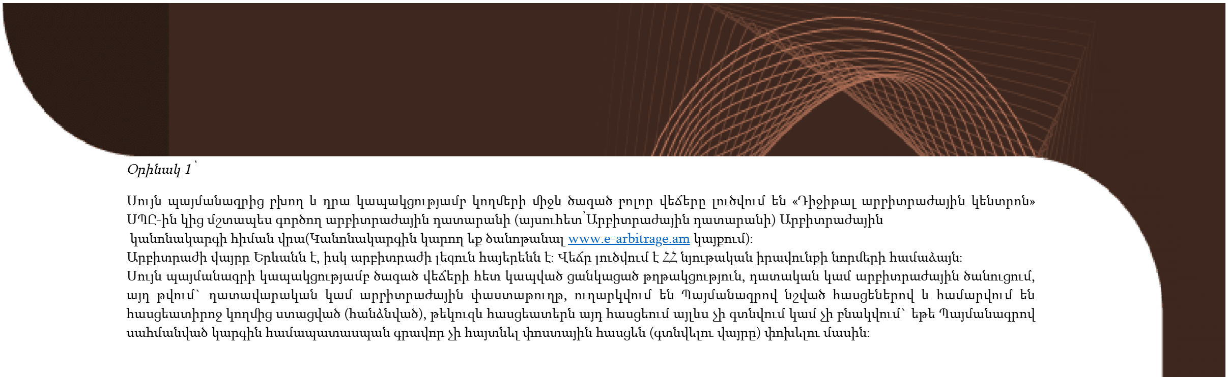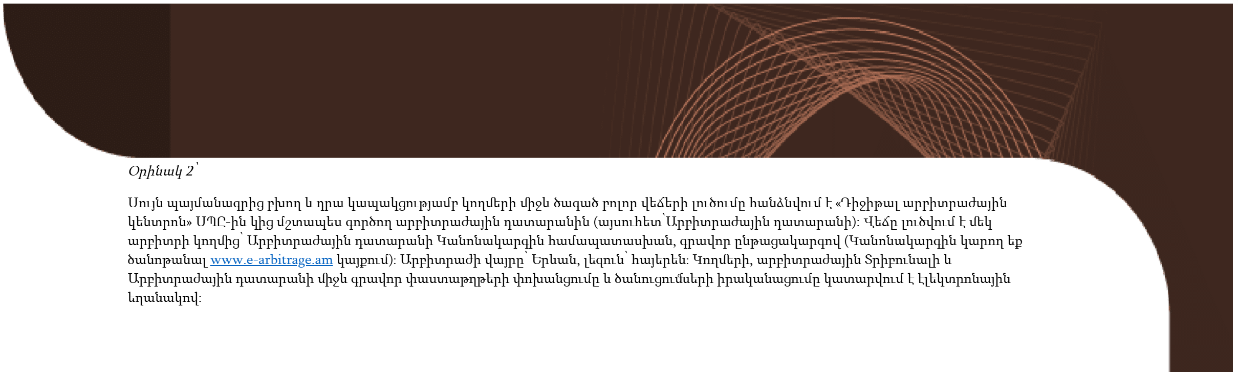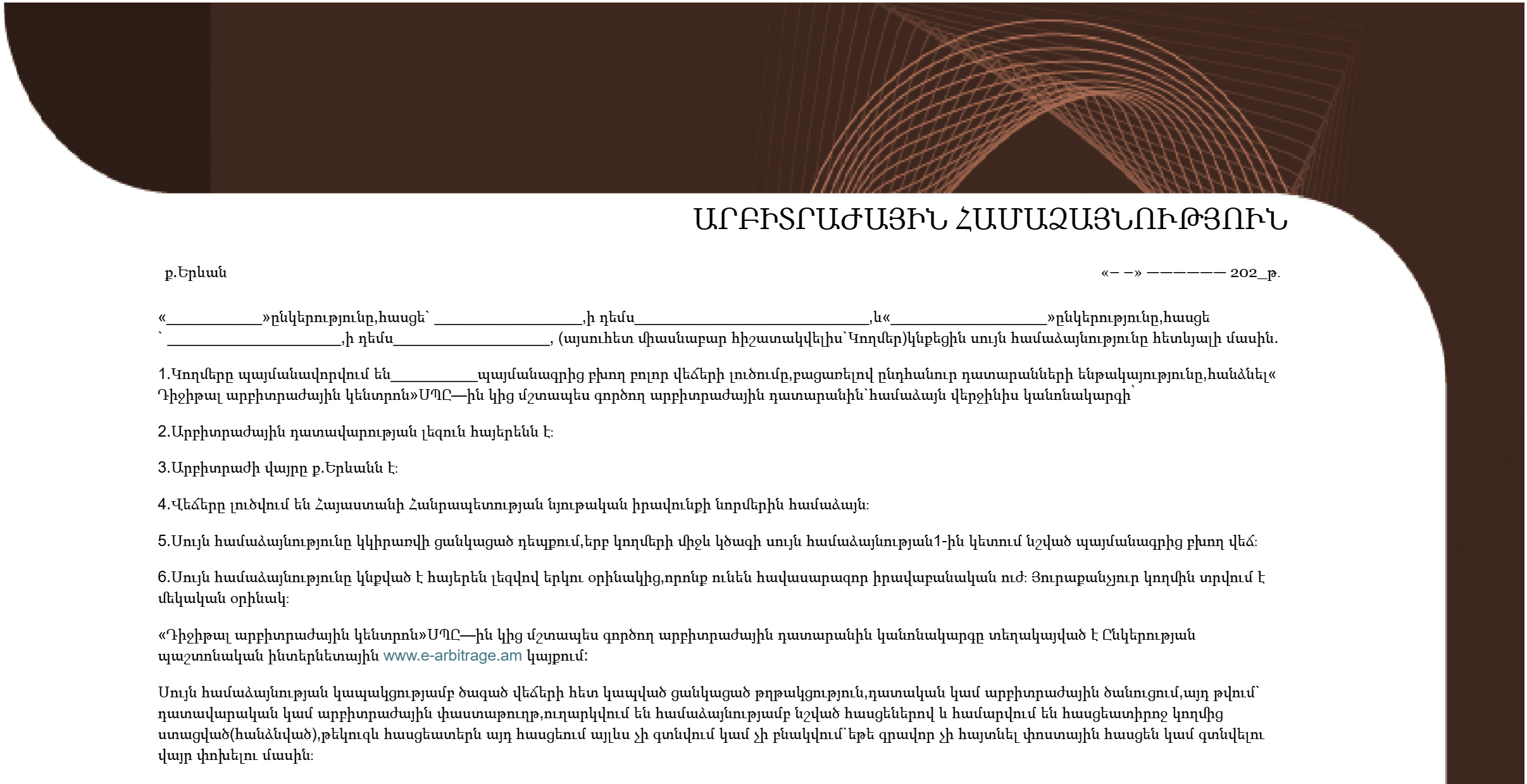 1. Կողմերը պայմանավորվում են __________ պայմանագրից բխող բոլոր վեճերի լուծումը, բացառելով ընդհանուր դատարանների ենթակայությունը, հանձնել «Դիջիթալ արբիտրաժային կենտրոն» ՍՊԸ—ին կից մշտապես գործող արբիտրաժային դատարանին ` համաձայն վերջինիս կանոնակարգի՝
